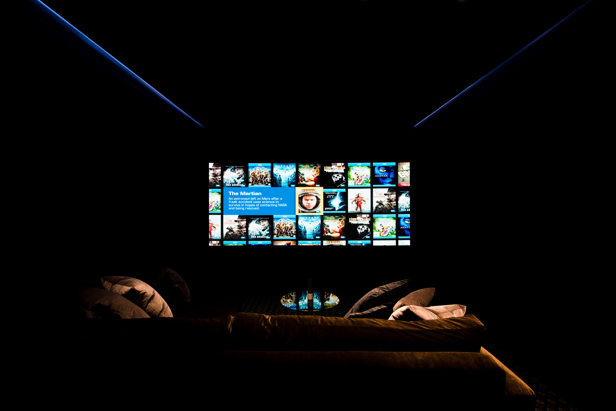 The Dolby Atmos configuration for this room was 5.1.4 which works perfectly for the seating position and size of room. A complete video and audio calibration was completed prior to handing over to the customer. The audio, video, lighting and control equipment are located in a separate room in a Sanus rack with just the BluRay and PS4 located in a cupboard in the bar area for ease of use.”