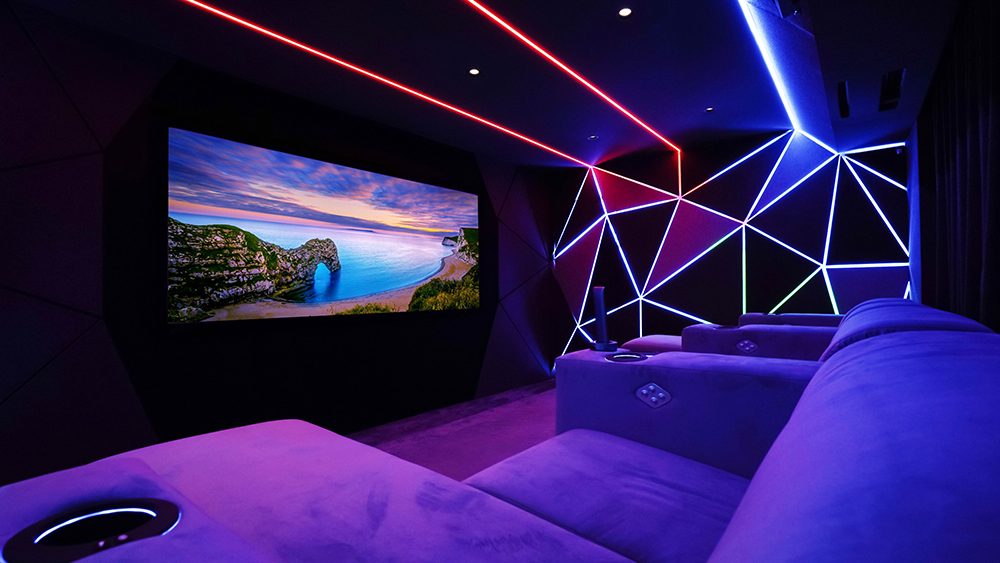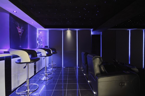 Kent Home Cinema stated: “Conversion of an existing room to a dedicated home cinema room which needed to include a control system which could be extended to other rooms in the future. Following a visit to the Artcoustic demonstration centre and hearing Dolby Atmos 7.1.4 they wanted to include this within the specifications. Working closely with Dolby and our Artcoustic the speaker positions were planned into the room taking into consideration the size, layout of the room, and also to work within the bar area at the rear of the room. A full design specification was provided to the clients building contractors for the construction of the front wall studwork, room down light positions, the pelmet around the room for the cable management and LED lighting, and the raised plinth for the two rows of home cinema seating.