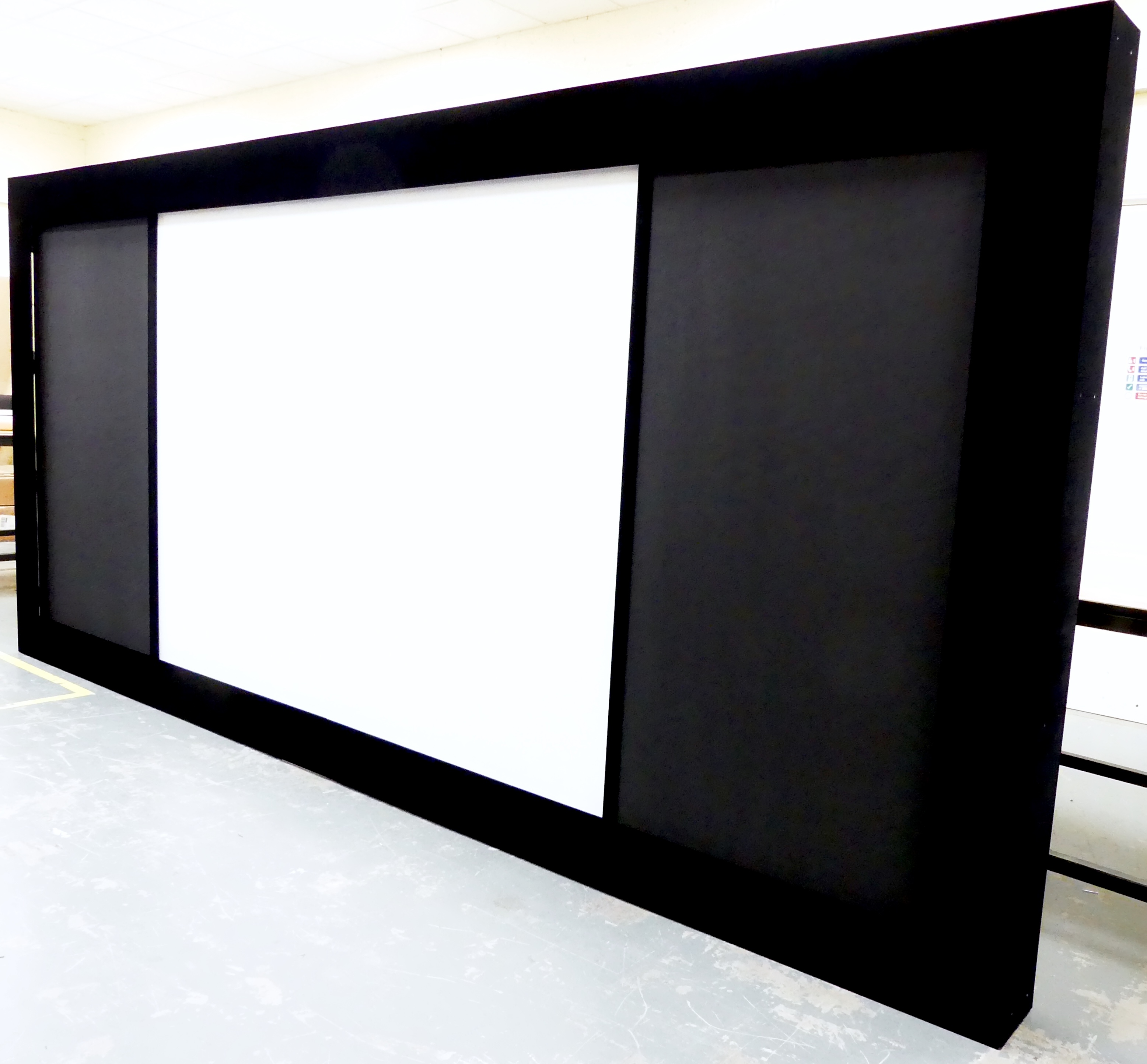 Lateral masking screens have a constant height and a native aspect ratio of 2.35/1 or 2.40/1 with sizes from 70 ’’ to 180’’ base width.